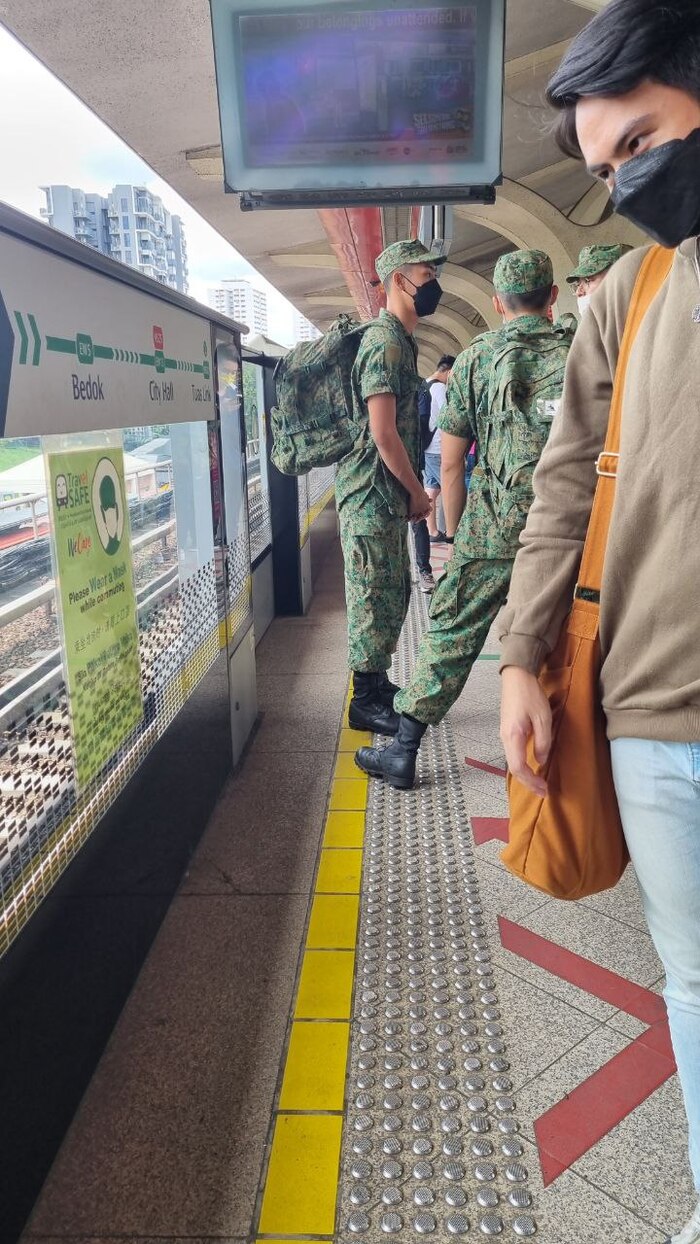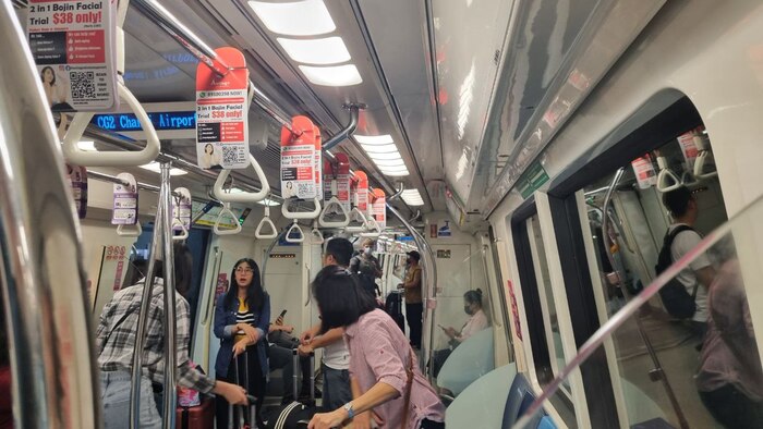 Хоть Сингапур и отказался уже от ношения масок в обязательном порядке повсеместно, но в метро они всё ещё нужны. От аэропорта идёт небольшая наземная ветка метро, аппендикс с двумя станциями. На станции Tarah Merah пересадка на зелёную ветку (East West Line). Поезд приходит на центральный путь - отдельный путь для поезда из аэропорта.