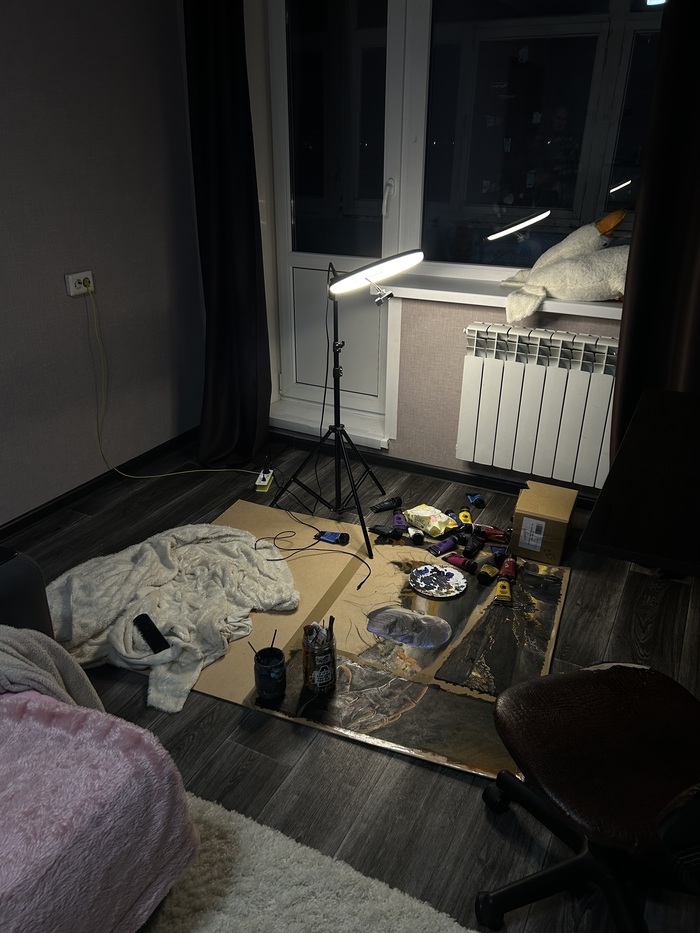 Работа весит в гараже у брата, у него там типо уютной мужицкой берлоги)