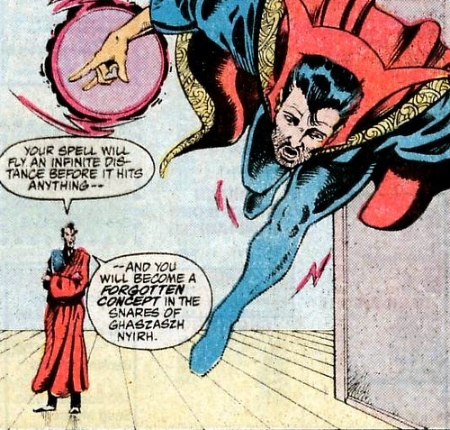 Но что там у Доктора Стрэнджа и Калуу? Ну, они взорвали храм, и теперь им противостоит сам Газагж Нирх. Доктор Стрэндж всё пытается противостоять ему силой света – но не получается. Он хочет защитить паломников – и Калуу создаёт защитный барьер, принеся одного из паломников в жертву. Но сила демона вскоре оказывается слишком велика. Калуу понимает, что его магии не хватит, а Доктор Стрэндж, зелёный новичок в магии тьмы, не справится. Он приказывает Стивену бежать. Доктор Стрэндж, уже зовущий Калуу своим учителем, отказывается бросать наставника в беде – и демон выбивает Стивену глаз. Тогда Стивен всё-таки обращается в бегство – и Калуу связывается с ним, проецируя свой голос через насекомое. «А теперь жахни!». Стивен обрушивает на демона всю мощь тёмной магии – и побеждает. А Калуу оказывается жив и здоров – он ослабил бдительность демона иллюзией, а сам временно принял облик насекомого. Но глаз Стивен потерял по-настоящему, и урок усвоил. Пути света больше не работают. Нужно всё-таки обучиться путям тьмы.