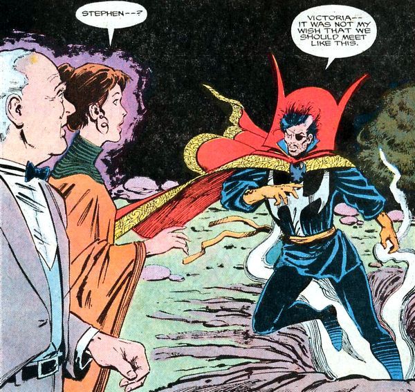 В Великобритании небо над поместьем Виктории Бентли заполняют демоны. Когда Виктория произносит заклинание, чтобы определить, какое плохое зло нависло над её домом, её артефакт для гадания воспламеняется. Из тучи демонов перед поместьем приземляется Доктор Стрэндж – небритый, нечёсаный, одноглазый. Виктория в шоке. «Погодь, ты же умер! Нет...я чувствую тьму! Ты демон в облике Стивена! – Не-не, это правда я. И я не умер, я просто изменил тебе память. Я сейчас сражаюсь с великим злом, и поскольку магия света мне больше недоступна, я колдую магией тьмы. – Я могу как-то помочь? – Ну вообще да. Но тебе не понравится». Стивен целует Викторию – и высасывает всю её магическую силу, до последней капли. Наследница знатного рода чародеев становится обычным человеком. А её роскошное поместье сгорает дотла, потому что хранящиеся там артефакты вспыхивают от избытка тёмной силы. Вот удружил так удружил...