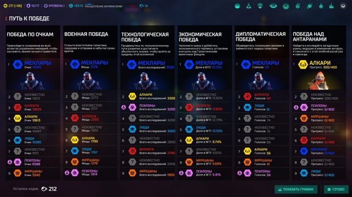 Для того чтобы превозмочь всех в игре существует трафаретный набор вариантов. Во-первых, вы можете выиграть игру по принципу всех убью - один останусь. То есть уничтожив всех оппонентов. Во-вторых, вас могут выбрать главой галактики. Этот способ честно говоря напрямую связан с первым. Так что воевать придется немало. Это вам не Цивилизация, поэтому культурным путем победить не получится - только твердая рука и геноцид. Также возможно выиграть путем превосходства - на конец игры (а идет она 500 ходов) у вас должно быть больше всего очков. Так вот по-простецки.