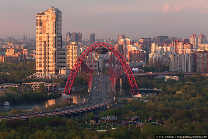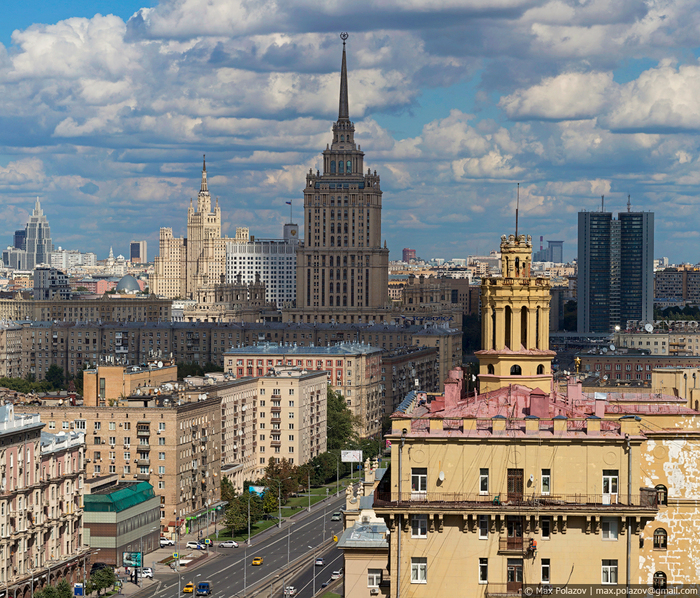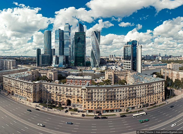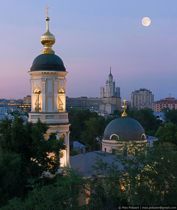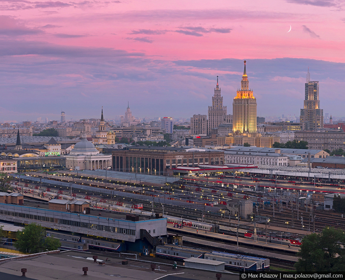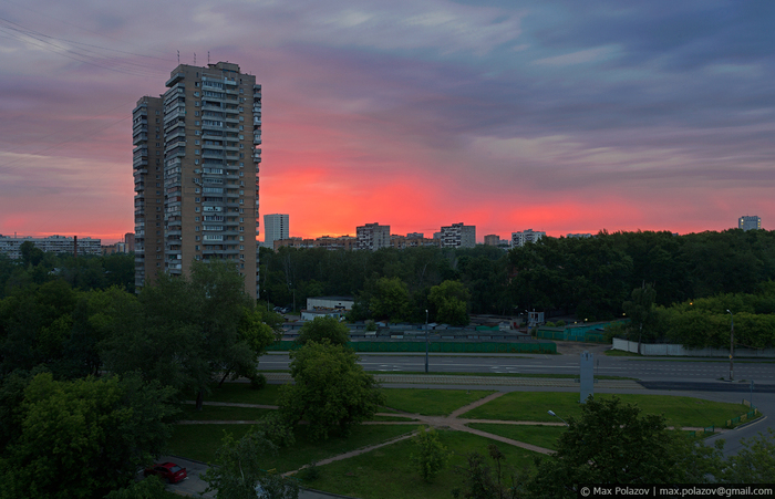 Полыхающее солнце закатилось за горизонт. В Москве-реке лениво проплывали потускневшие вереницы синеющих облаков. Томительное ожидание было нарушено приветливо мигнувшим корпусом главного штаба сухопутных войск на горизонте. Вслед за ним, почти синхронно, словно лампочки в новогодней гирлянде по набережной побежали разгорающиеся огоньки уличных фонарей. Засияли парадные фасады Фрунзенской, засветилась вертикальная параллель высоченных труб 12й ТЭЦ, офисные жители устало покидали монолитные башни Сити, не выключая за собой свет. Маяками зажглись далёкие шпили величественных сталинских сестёр, направляя в пути всех бредущих по зелёным скверам и проспектам города. Подвела лишь иллюминация главного виновника торжества - Городской клинической больницы № 1, вокруг 200т летнего здания которой, мы так старательно и строили задуманный кадр. Её подсветка почти неуважительно сильно опаздывала, а наконец прибыв на съёмочный процесс, включилась лишь частично. Сложившийся казус пришлось исправлять в фотошопе (и это было не легко).