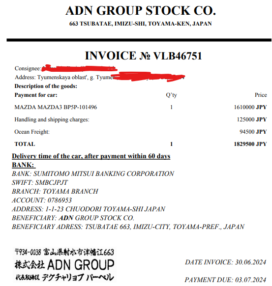 Далее мне присылают инвойс аукциона, вот прямо японский лист. Иди с этим листом в ближайший к тебе банк, который еще не отключен от Свифта (а такие есть, внезапно. А я думал Россию полностью от него отключили).