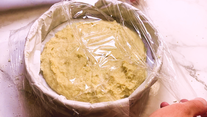 Замешиваем тесто, формируем булочку, накрываем пленкой и оставляем в теплом месте на час всходить.