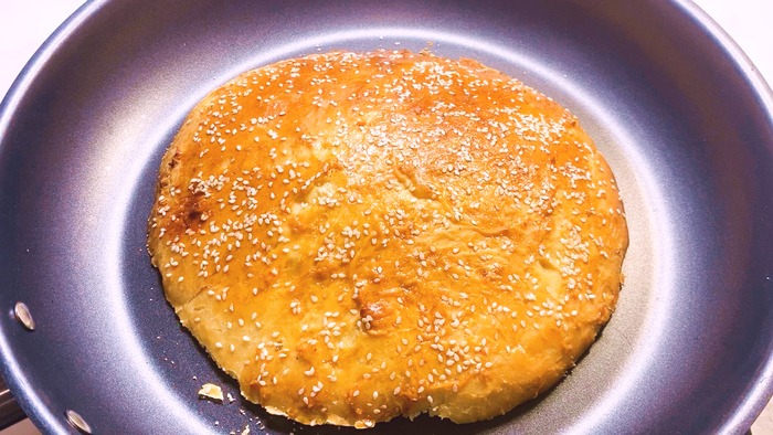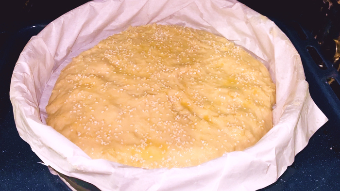 Смазываем булочку яйцом, посыпаем кунжутом и отправляем в духовой шкаф при 180 градусах на 30 минут.