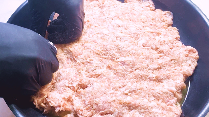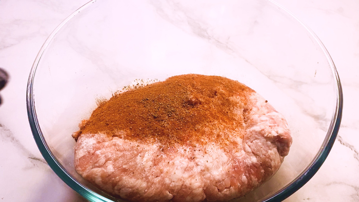 Затем фарш приправляем черным молотым перцем, приправой к мясу и хорошенько перемешиваем.