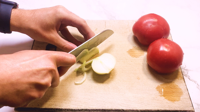 Когда все приготовлено лук нарезаем полукольцами.