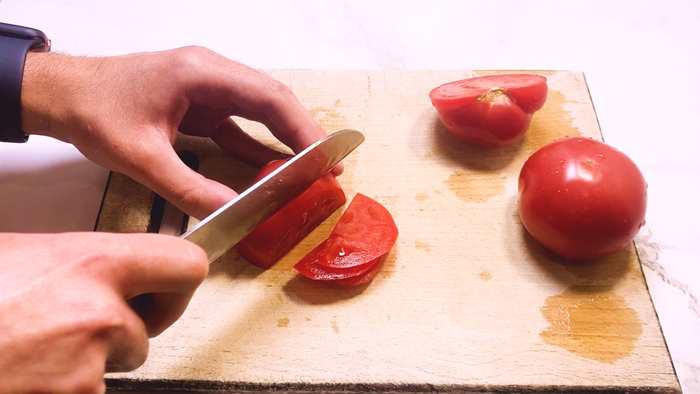 Помидоры также нарезаем полукольцами.
