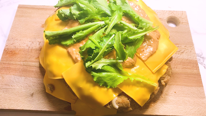 Потом собираем бургер на булочку выкладываем листья салата, поливаем их соусом, выкладываем помидоры и огурцы, накрываем их сыром. Поверх сыра кладем котлету, на котлету кладем лук, на лук выкладываем ещё сыр, поливаем это все соусом, на соус кладем листья салата и накрываем все верхней булочкой.