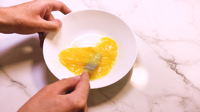 Затем в тарелку разбиваем яйцо и перемешиваем его.