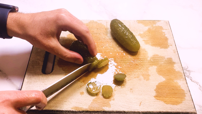 Маринованные огурцы нарезаем колечками.