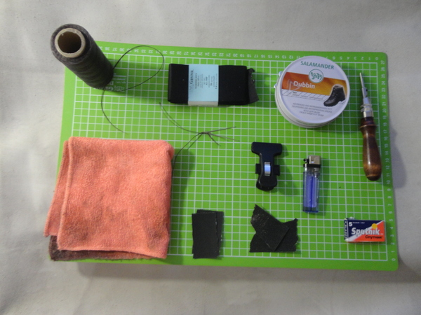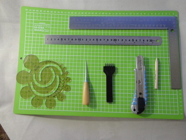 Угольник, линейка, линейка с радиусами, шило, шаговый пробойник (я использую,, с круглыми отверстиями), нож, карандаш, нитки, атласная лента, воск для обуви, торцбил (кромкорез), тряпка (в идеале сликер, но я его потерял), пара прищепок, зажигалка, наждачная бумага (Р80, Р600), лезвия, ручной пробойник.