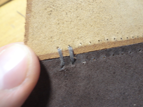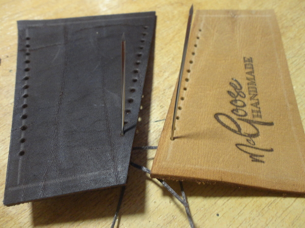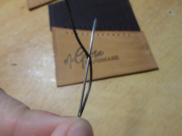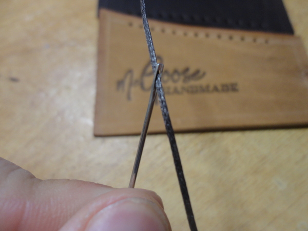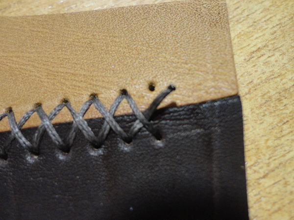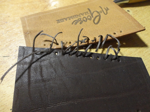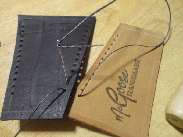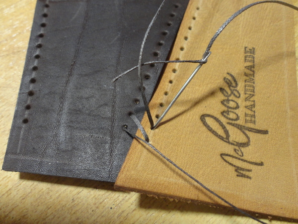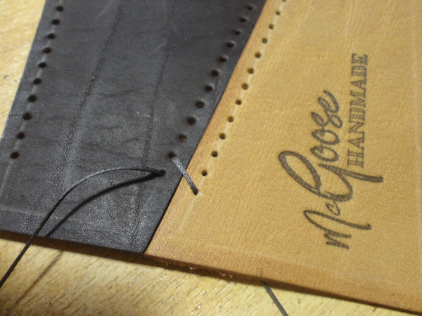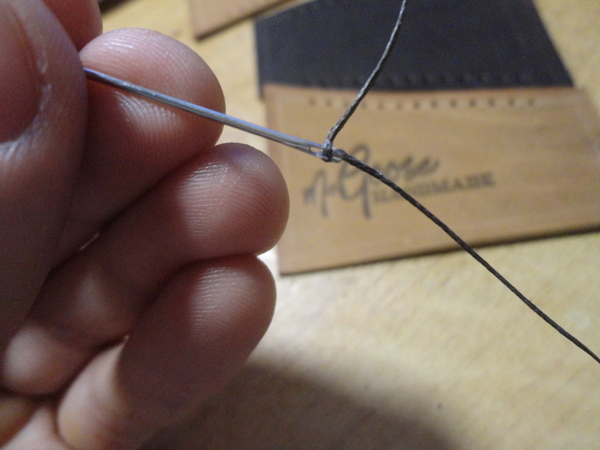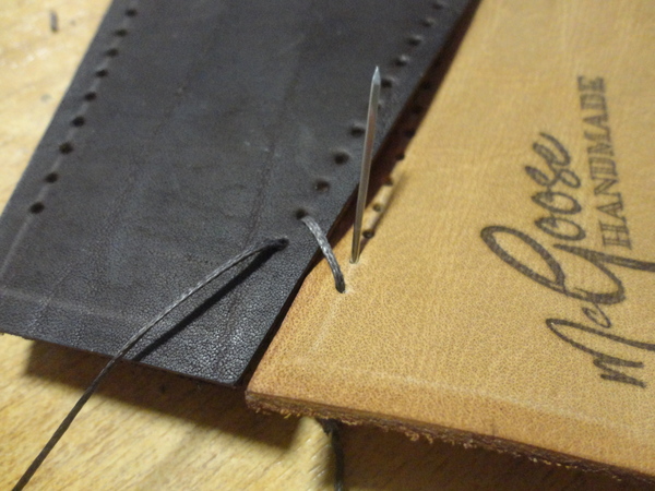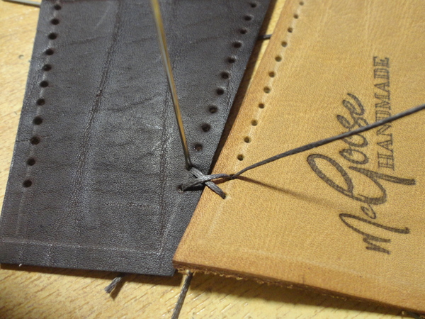 Завершаем шов, делаем два возвратных шва, на третий проходим между слоями кожи: