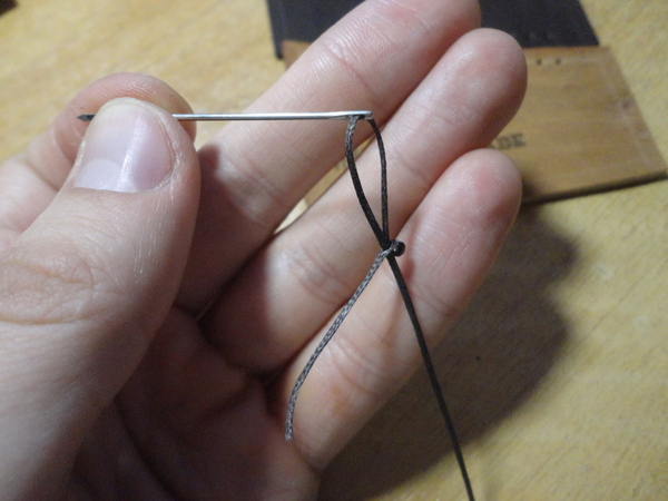 Вдеваем нить в иглу с обоих концов нити, делаем узлы: