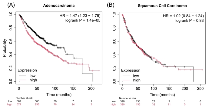Аденокарцинома (ADC) и плоскоклеточный рак (SQC) являются двумя наиболее распространенными подтипами немелкоклеточного рака легких (НМРЛ), которые вместе составляют большинство случаев как НМРЛ, так и рака легких в целом. Хотя NELL2 в основном изучался при таких видах рака, как почечно-клеточный рак (ПКР) и гепатоцеллюлярная карцинома (ГЦК), значительное улучшение показателей выживаемости пациентов было связано с высокой экспрессией NELL2 в АЦП легких (рис. 6А). Однако эти преимущества, по-видимому, не распространяются на SQC легких (рис. 6Б).