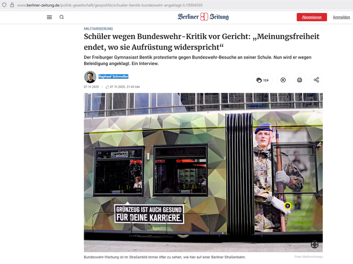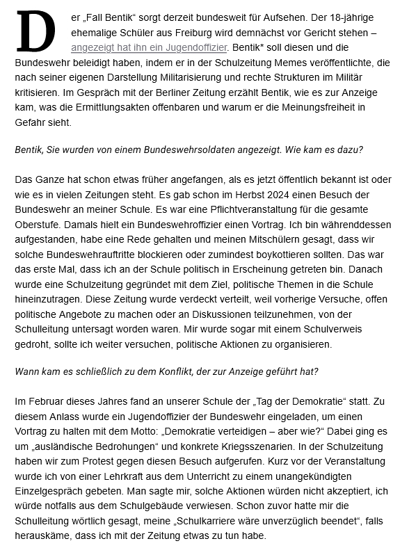 «Дело Бентика» в настоящее время привлекает внимание по всей Германии. 18-летний бывший ученик из Фрайбурга вскоре предстанет перед судом — на него подал заявление офицер по работе с молодёжью. Предполагается, что Бентик оскорбил последнего, а также Бундесвер, опубликовав в школьной газете мемы, которые, по его собственному заявлению, критикуют милитаризацию и правые структуры в армии. В интервью Berliner Zeitung Бентик рассказывает, как было подано заявление, что раскрывают материалы расследования, и почему он видит свободу мнений под угрозой.