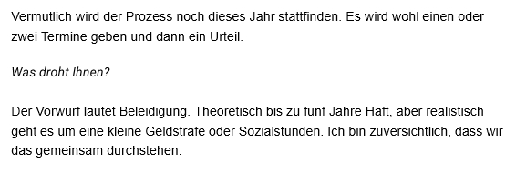 Во-первых, это не совсем так. В материалах иска Бундесвер прямо указан как пострадавшая сторона. В обвинительном заключении говорится, что офицер по работе с молодёжью подаёт заявление «от своего имени и от имени своего работодателя». Я не считаю, что здесь речь идёт в первую очередь о личных чувствах. Тот, кто критикует Бундесвер в школах, затрагивает больную тему. Речь идёт о публичном ставлении под сомнение вербовки новобранцев и милитаризации — и именно здесь Бундесвер реагирует болезненно. Поэтому этот непропорциональный судебный процесс.