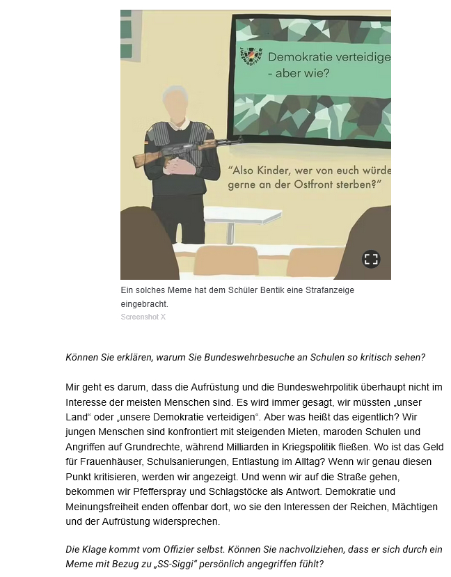 Во-первых, вообще не установлено, что мемы создал именно я — это будет решено только в суде. Я считаю их допустимыми, но это нужно доказать. По содержанию они явно подпадают под свободу мнений и сатиру. Речь идёт о критике присутствия солдат в школах и о правых тенденциях в Бундесвере, а не о личном оскорблении. Тот, кто агитирует в школах за Бундесвер, должен быть готов и к критике. И независимо от того, каким будет вердикт: этот протест законен, даже если суд решит иначе.