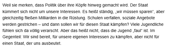 Потому что они видят, что политику делают за их спиной. Государство не заботится о наших интересах. Постоянно твердят: «Мы должны экономить», но в то же время миллиарды уходят на вооружение. Школы разваливаются, социальные программы сокращаются — и за такое государство мы должны сражаться? Многие молодые люди чувствуют себя принятыми за лохов. Но это не значит, что молодёжь «ленивая». Наоборот: мы готовы бороться за свои собственные интересы, но не за государство, которое нас эксплуатирует.