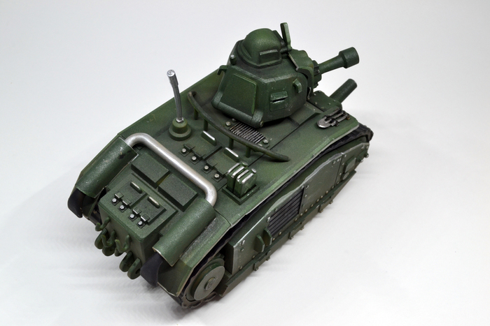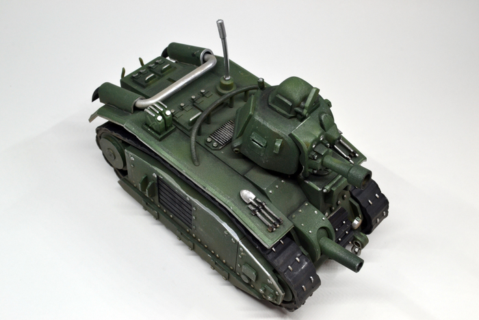 О модели: сборная пластмассовая модель от фирмы MENG в масштабе 1/35. Набор очень порадовал своим качеством и приятными бонусами, идущими в комплекте поставки. К таковым относятся: подставка-диорама с пулемётом Гочкисса, фототравление и металлические детали, полностью рабочая гусеница из траков, собираемых без клея. Таким образом при должном старании можно создать модель с подпружиненной подвеской, перематывающейся гусеницей и вращающимися колёсами. Нужно ли это - решать Вам. Также набор имеет интерьер башни и места механика-водителя, что позволяет выполнить модель с открытыми люками.