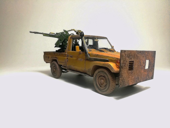 Сборка модели наиприятнейшая. В теории всё собирается без клея, но я на всякий случай мелкие дели проклеивал. Красил аэрографом (прешейдинг, база и пыль), кистью (мелочёвка) и попробовал специальный "металлический" маркер (болты/заклёпки, антенна и сколы/потёртости).