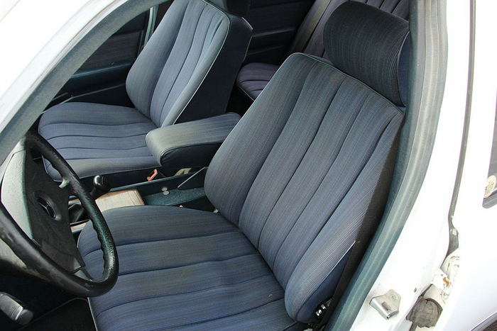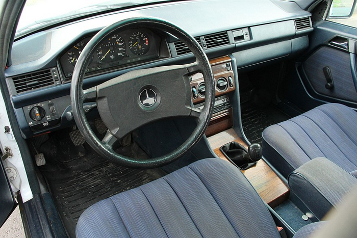 А какой тут вкусный салон! Мягкий синий винил у немцев нередко сочетался с белым колером кузова. Двести тысяч километров почти никак не сказались на состоянии интерьера: трещин не найти ни на пластике, ни на лакированном дереве. Так и хочется ткнуть носом «свидетелей Камри» в интерьер 35-летнего Мерседеса и показать, как оно вообще должно быть.