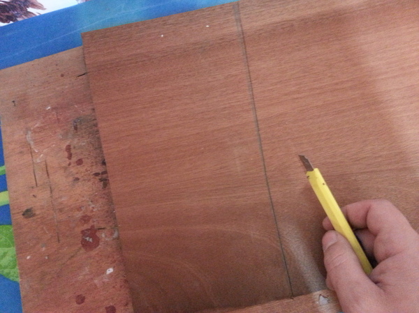 Прирезка. Шпон накладывается друг на друга прижимается и режется. Делается это для того что бы линия стыка была как можно незаметнее, а в идеале ее вообще не было. Вот тут то и нужен хороший острый нож.