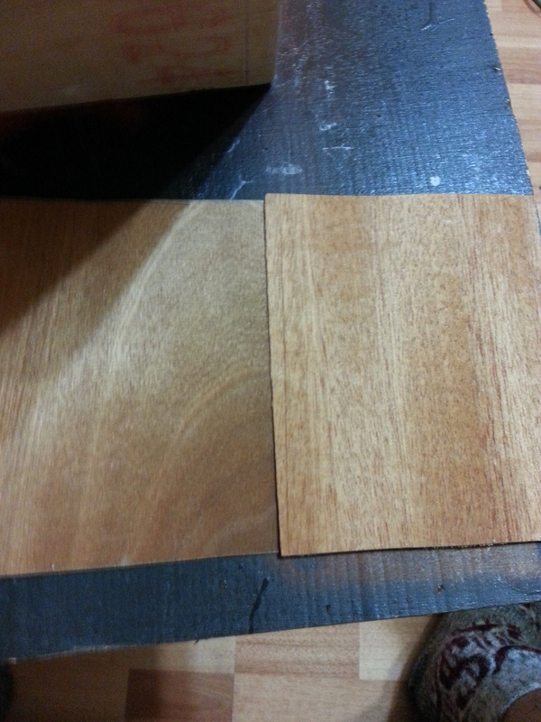 Вот и шпон собственной персоной. Красный, сухой и очень колкий. 30 см ширина и толщина примерно в 1.25 мм. Для шпонирования гнутых деталей не годится. Но мне пойдет)) на детали не большие углы изгиба. На следующей детали, самой сложной по форме, придется эксцентриком стачивать толщину до 0,75-0,5 примерно. Заводской шпон примерно такой.