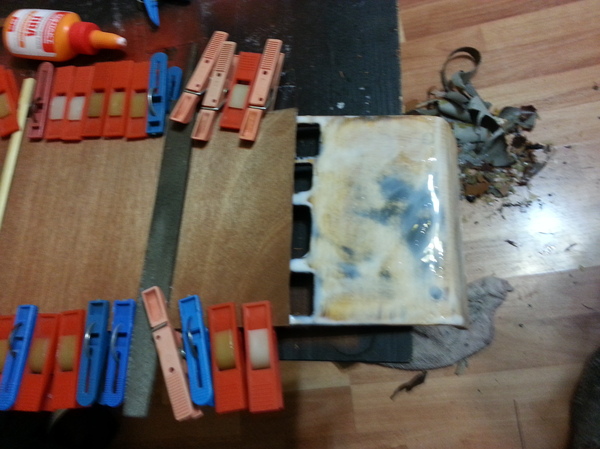 В итоге по ширине углубления был выточен брусок, заготовка перемазана клеем и на сухую шпон под бруском прижимался с помощью трех струбцин.