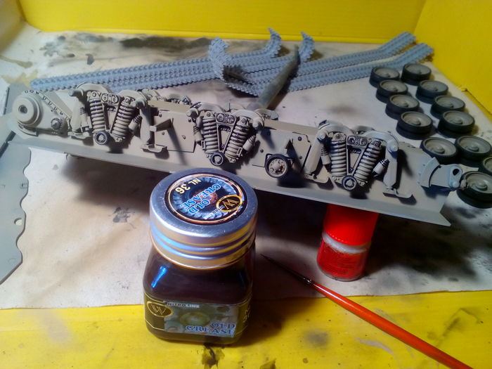 На деталях подвески (которых на готовой модели почти не будет видно) я потренировался пользоваться новой для меня химией - нитро-краской Wilder Old Grease, предназначенной для создания эффектов застарелого загрязнения ГСМ.
