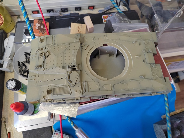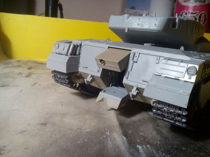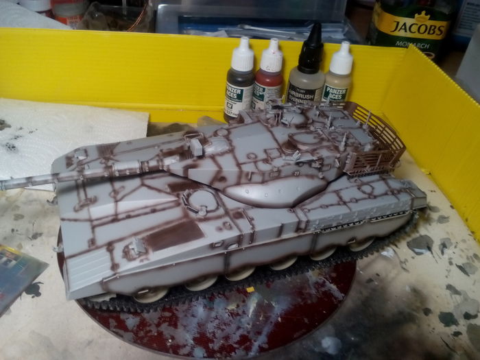 Нанесён базовый цвет, при помощи добавления белой краски в готовую смесь в ёмкости аэрографа сделаны высветления, чтобы подчеркнуть сложную многогранную форму танка. Модель задута глянцевым эмалевым лаком Humbroll.