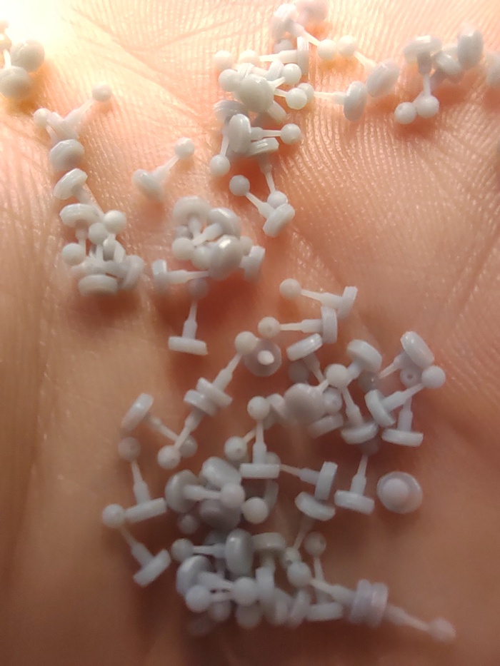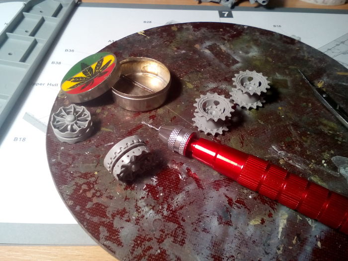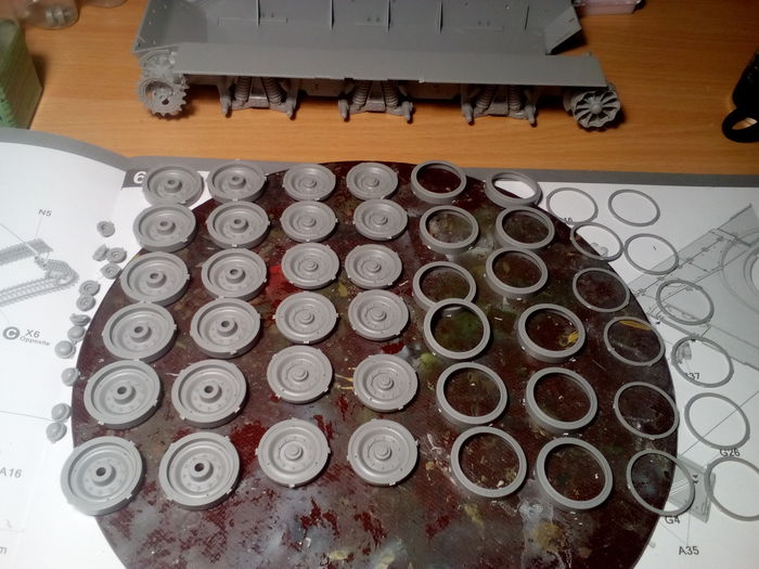 Каждый опорный каток состоит из 5 деталей. Это даёт бонус при покраске (можно не использовать маски, а просто покрасить бандажи отдельно), но зато отнимает уйму времени на обработку. Хорошо хоть у израильтян нет подвески Книпкампа, как на "Тиграх")))