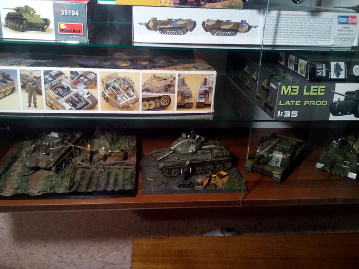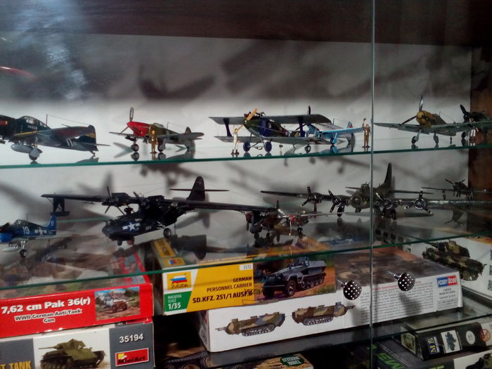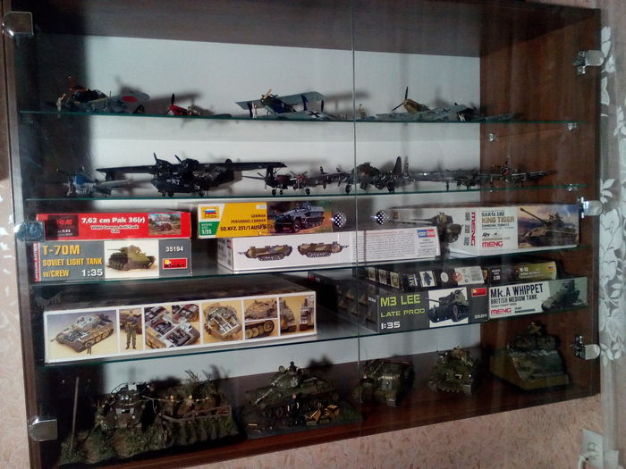 Небольшой бонус для интересующихся: Недавно закончили и доставили мне домой сделанную на заказ полку-витрину для моделей. Шкаф вышел немаленький и увесистый, однако весьма вместительный. Поскольку проектировался стенд в основном для будущих работ, экспозиция в нём временная, а пара полок отведены под несобранные наборы.