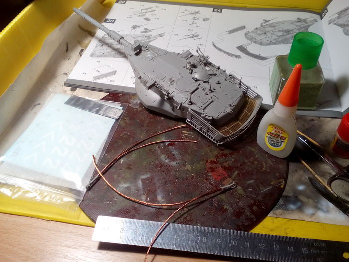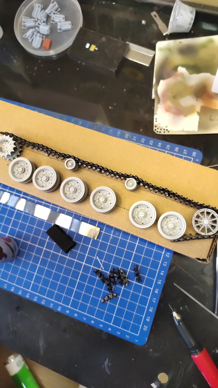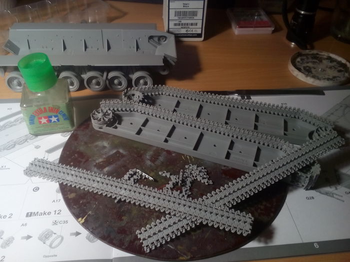 В общем мечта обернулась каторгой. Без 100 грамм не подходил к еврейчику. Сильно ступил скоеив нижнюб и верхнюю часть до установки гуслей. Пришлось повозиться с ними. Они шли отдельными траками и собирались исключительно на клей. Были планы сделать мягкие мешки в корзины сзади и прочую требуху, но так устал от сборки, что ограничился только канистрой. Еще и лопату кот спёр. Что получилось то получилось.