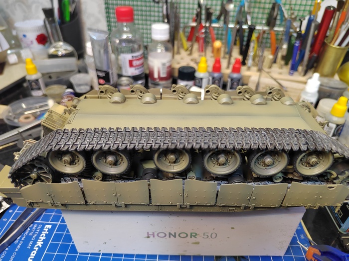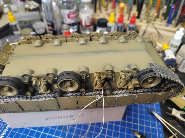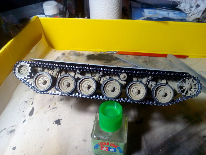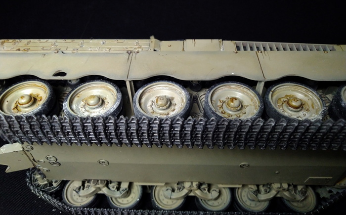 Нижняя часть корпуса и катки покрыты акрилово-виниловой чёрной грунтовкой от Vallejo, затем окрашены в базовый цвет (я использовал не IDF Desert, а Highlight Japanese Tankcrew серии Vallejo Panzer Aces, который по-моему намного ближе к оригиналу).