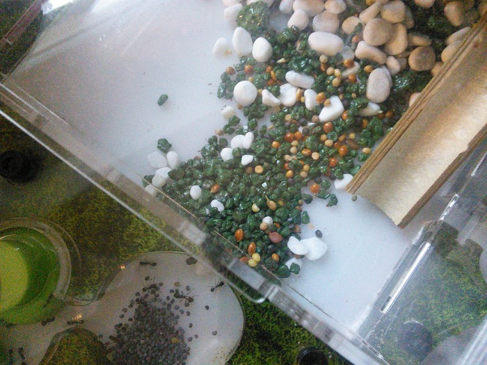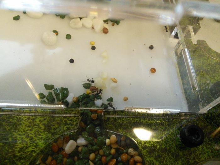 Возвращаясь к нашему исследователю: он обошёл глюкозную каплю со всех сторон и направился в спасительную тень навеса нового дома. Спустя непродолжительное время он вышел из под навеса и, уже уверенными шагами направился к матке. Недолго пообщавшись с маткой и крупным мурашом он стал выталкивать их к выходу. Но, тк авторитетом он в компании не пользовался: они вернулись на насиженное место. Мелкий не стал бездельничать и решил заняться уборкой: собрал заплесневевшие шмотки ваты и в несколько заходов отнёс их в шлюз, в старом доме стало уютнее.