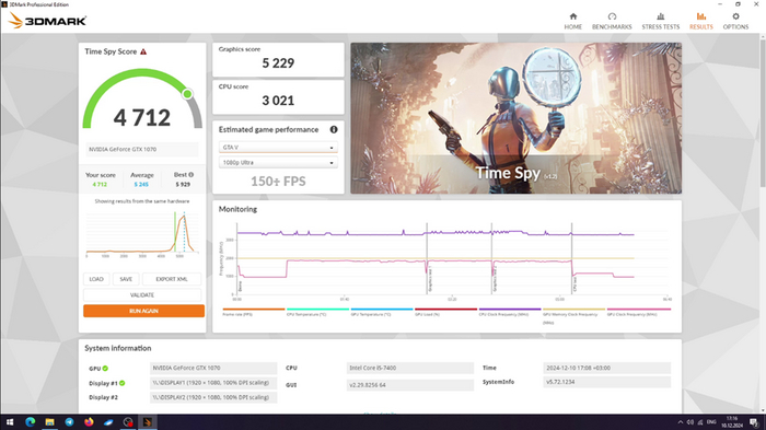 Здесь я прогонял тест Time Spy для Full HD. И вот он меня порадовал. Система набрала в тесте 4712 балла и держится в уверенной зеленой зоне производительности. Понятно, что это не максимальный жир, но я ожидал худший результат.