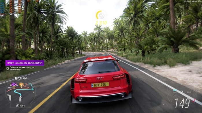 Первым делом я решил окунуться в гоночки. Хорайзон пятый довольно красивая игра, хотя именно физика мне в ней не нравится. Но это вкусовщина. Форзу я сначала запустил на высоких, а потом и на очень высоких настройках графики (но еще не на ультре). На высоких мне не очень понравилась детализация, в итоге покатался я пару часов на очень высоких. Как правило игра показывает в районе 60 FPS, но при массовых гонках, столкновениях и так далее, по метрикам видно что утилизация как процессора, так и видеочипа уходит под соточку. И в этот момент кадры проваливаются до 40 в секунду, а на записи в OBS при этом видны фризы – система упирается и в процессор и в карточку.