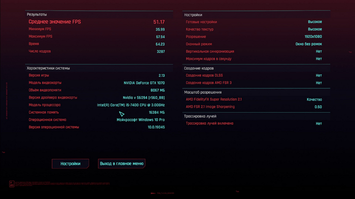 Что я ожидал от киберпанка? Понятно, что лучей на карте нет. Ожидал я, что этот старичок еле-еле потянет на средних настройка 40 FPS. Так что, когда я запускал внутренний игровой бенчмарк, иллюзий у меня не было. А вот увидев средние FPS 61.8, я сильно удивился 😊