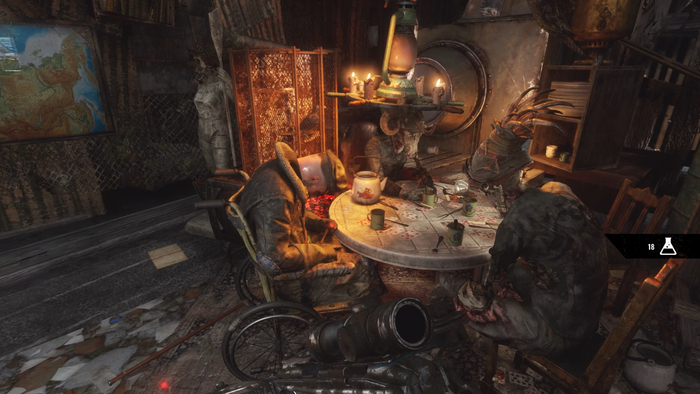 Уже с первых минут «Исход» даёт ощутить то самое настроение первых игр. Она встречает знакомыми с первых частей тёмными тоннелями, со слабо пробивающимися с поверхности потоками света. Эта неповторимая атмосфера «Метро», когда ты достаёшь свою верную зажигалку, чтобы сжечь паутину, преграждающую путь, и при этом слегка подсветить себе дорогу, а на фоне слышны лишь едва уловимые звуки капающей воды или скрежета металла.