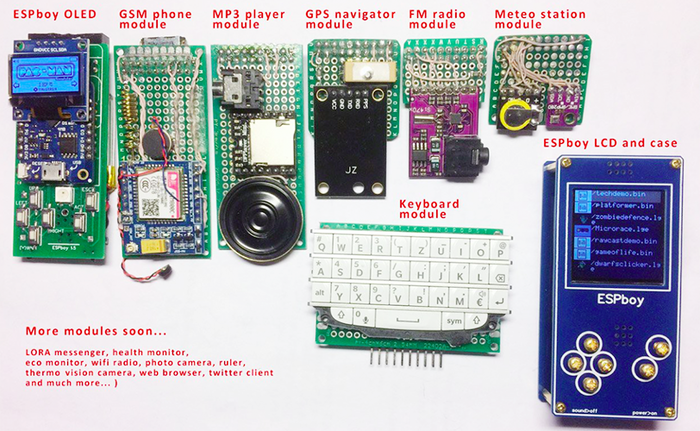 Уже сейчас доступны готовые модули, вставляя которые в разъем расширения ESPboy и заливая прошивку, можно получать полнофункциональный гаджет на выбор: метеостанция, mp3 плеер, fm приемник, навигатор, клавиатура, GSM телефон. Код естественно доступен на GitHub.