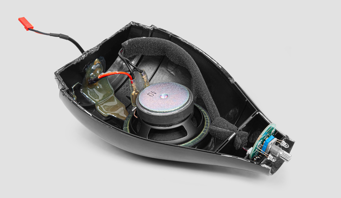 Стенки имеют красивую сложную форму и сделаны из плотного пластика 4 мм, сам сабвуфер имеет значительный, если не сказать большой размер. Самое главное - излучатель размером 6,5 дюймов, закрывающий требуемый диапазон низких частот. Это не потоковая имитация (по типу 3,5 дюйма + «гудящая» коробка), а полноценное устройство с фазоинвертором, объемом и хорошим динамиком. Сам НЧ динамик выполнен из композитных материалов.