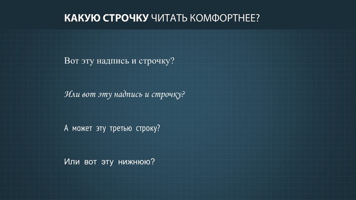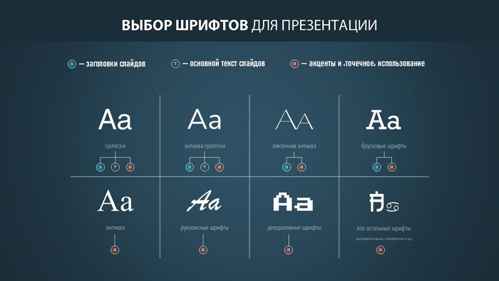 Однако, это не исключает использования в презентации шрифтов с засечками: они уместны при крупной типографике, например, для оформления заголовков или выделения ключевых фраз — т.е. для оформления смысловых акцентов.