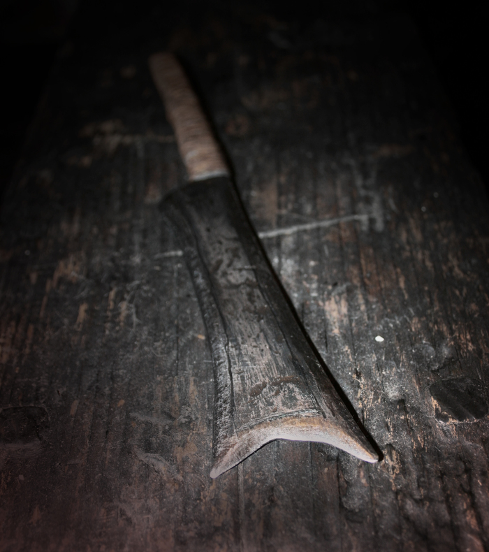 Снимков этапов создания к сожалению не имею, хотя там ничего экстравагантного нет; нашел в сарае железную балку, очертил контур, отрезал болгаркой, обработал шлифовальным кругом, нагрел до чёрной оксидной плёнки для эффекта грубости, далее шлифовка краёв и обмотка ручки - вот и готов ятаган. Так он что-то и пролежал с 2015 в закромах, но вот вспомнил о нём для демонстрации впервые на "Пятничном моё". Жаль из-за отверстий в балке получилось не 100% сходство по форме, но думаю уруки были бы довольны.