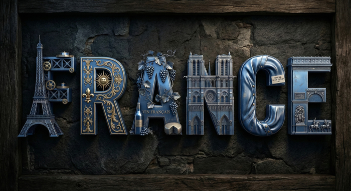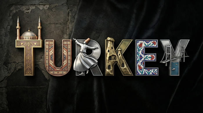 Высококачественное 3D-металлическое типографское изображение слова [СТРАНА] на темном текстурированном фоне, которое дополняет индивидуальность [СТРАНА], создавая кинематографичный визуальный тон премиум-класса.