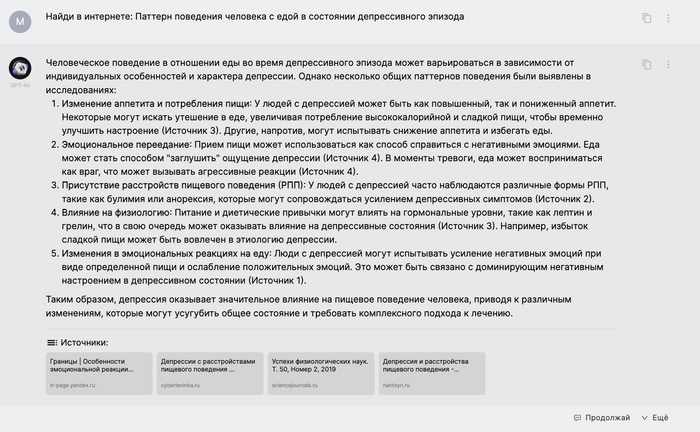 Если ChatGPT «зависнет» на полуслове, можно написать “continue”, и, вероятнее всего, модель продолжит генерацию ответа, или нажать кнопку “regenerate response”, но в таком случае она предложит новую версию ответа — это не плохо само по себе, ведь можно сравнить разные варианты, но это не то же самое, что «продолжить» предыдущий ответ — имейте это в виду.