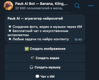Если не хочется разбираться с интерфейсами разных AI-платформ, можно использовать агрегаторы нейросетей. Один из таких инструментов — Telegram-бот Pauk AI, который объединяет несколько моделей генерации изображений в одном интерфейсе.