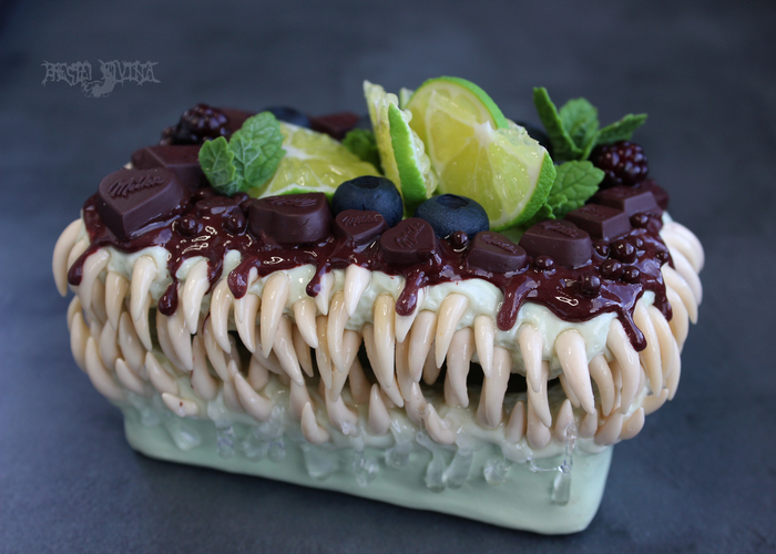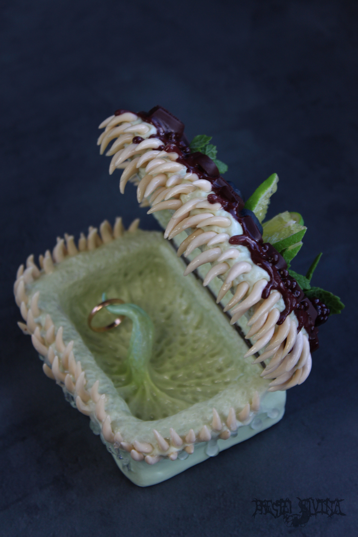 Только к концу работ с деревяшками начал думать как и из чего делать сундучьи зубы. Решил взять полиморф. Формируется в теплой воде и застывает превращаясь в пластик. Для всякой починки он ок, но для лепки ваще нет. Упоролся, но сделал из него нижний ряд и понял, что навалял херни. Нормальную форму придать сложно, обработать после затвердевания тоже толком не получается и крепится все через задницу, все шатается и отваливается. Хотя выглядит прикольно. На помощь пришла самоотвердевающая масса типа керамики или пластика, посаженная на жидкий гвоздь. И не пришлось сношать себе мозг запеканием и прочими сложностями.