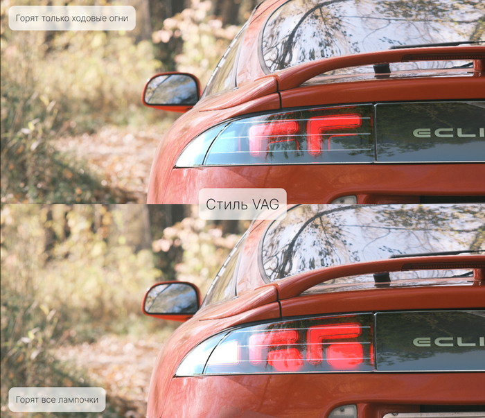 Затем я увидел задние фонари чего-то ваговского. Как-то не запомнил модель машины, но образ в голове отложился. Решил адаптировать под свой корпус.