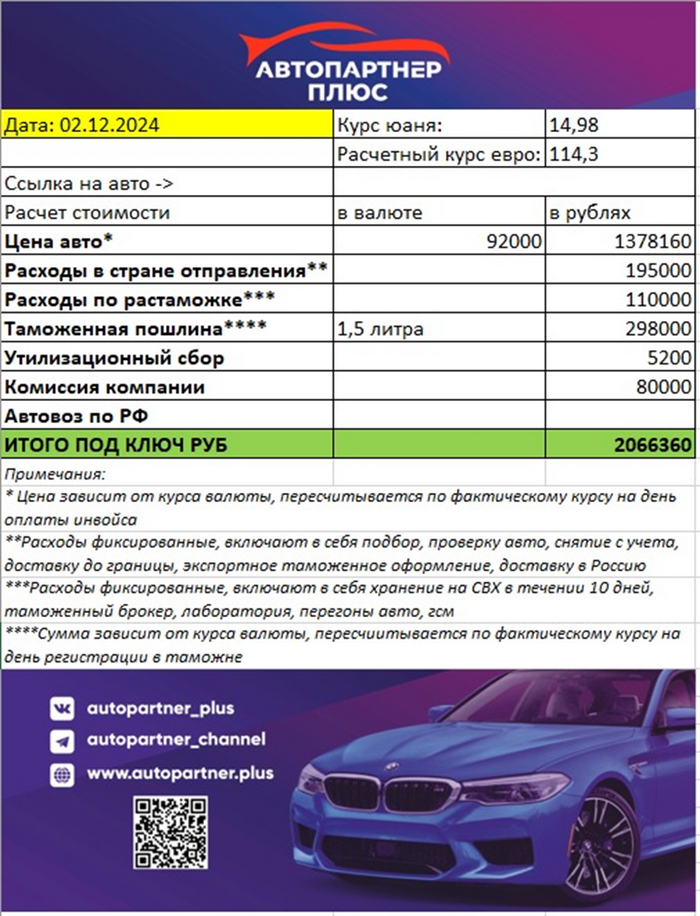 Стоимость под ключ со всеми расходами до Уссурийска/Владивостока (откуда клиент может забрать либо самостоятельно либо автомобиль может быть погружен на автовоз для отправки по России, прайс на автовоз будет приложен ниже) на сегодняшний день 2066360 руб.